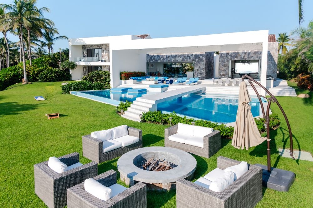 A resort-style pool, expansive social areas, and dedicated entertainment spaces—including media and game rooms—make it one of the best villas for holidays in Punta Mita.
